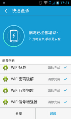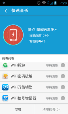 除此之外,那些为了蹭免费网络,下载WiFi破解等软件的用户也要加倍小心。近日,安全先锋安全团队捕获一款名为“多重扣费四代”的手机恶意软件,伪装成“WiFi 万能钥匙”、“WIFI密码破解”、“WiFi信号增强器”等客户端,诱惑用户下载安装,一旦用户手机感染了此款病毒,后台就会私自发送短信订购扣费业务并屏蔽10086反馈短信,这些短信费用大多在2元到10元不等,给用户造成话费损失。不敢想象,蹭个网也会成为手机病毒攻击的对象,甚至随时面临个人隐私泄露、网银被盗刷的风险。目前手机安全先锋已实现对“多重扣费四代”病毒的全面查杀。用户可以使用手机安全先锋对已感染的病毒进行查杀。