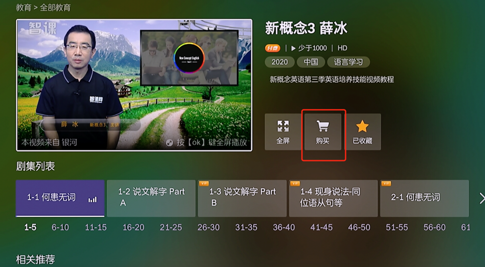 1.选择需要观看的付费内容进入具体节目播放页面,遥控器选择“订购”按钮;